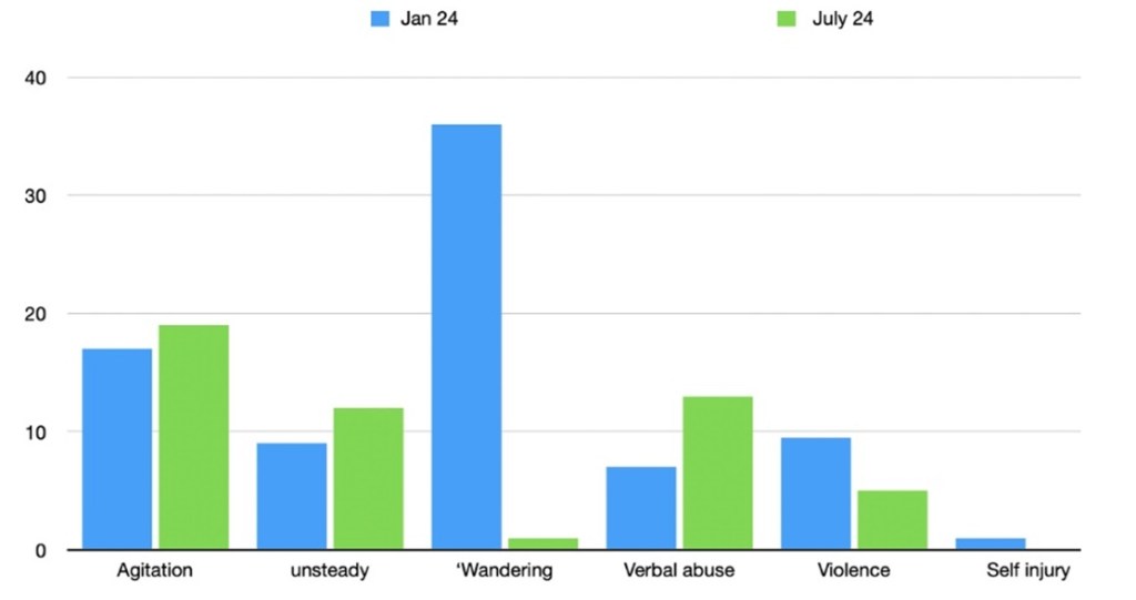 Figure 2 illustrate how a person’s behaviour will change over a period of time. This enables the care provider to help identify trends and themes for certain behaviours that may indicate a need for 1-1 support or a reduction of hours. It can be seen below that in this case whilst agitation, unsteadiness and verbal abuse have increased, violence towards others and wandering have decreased. The latter by a more than 90%.